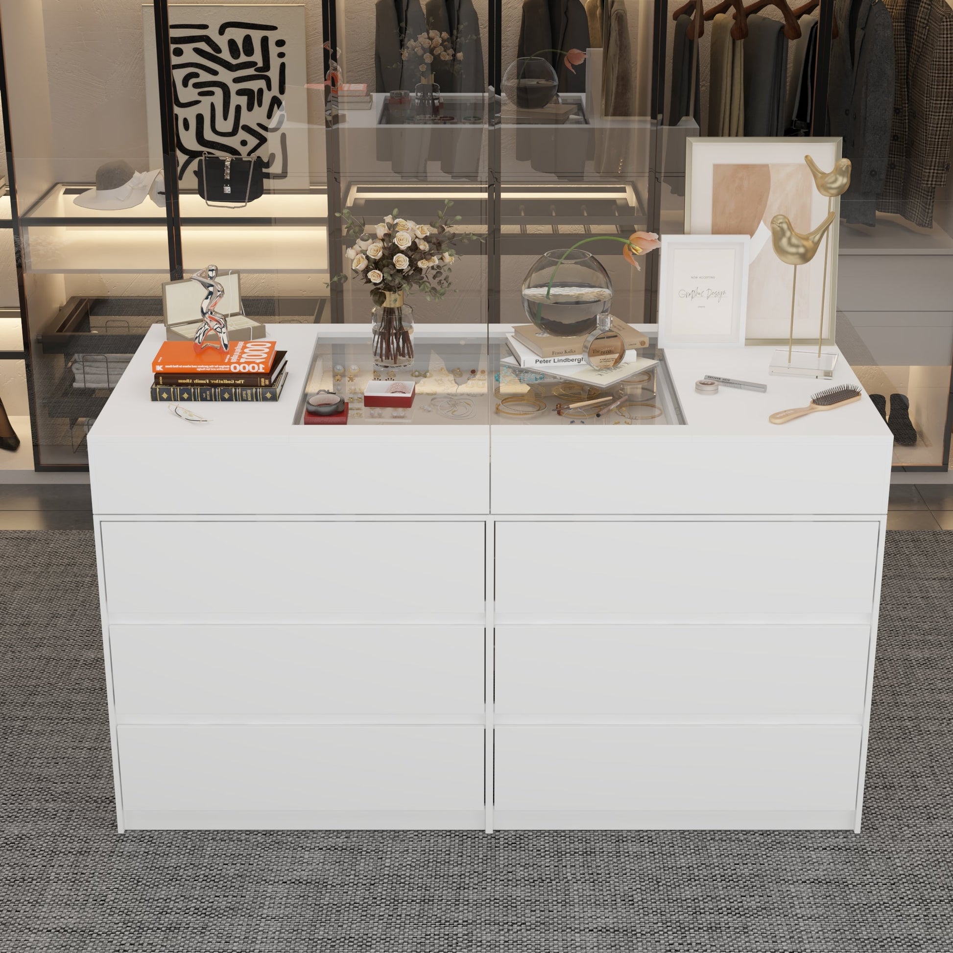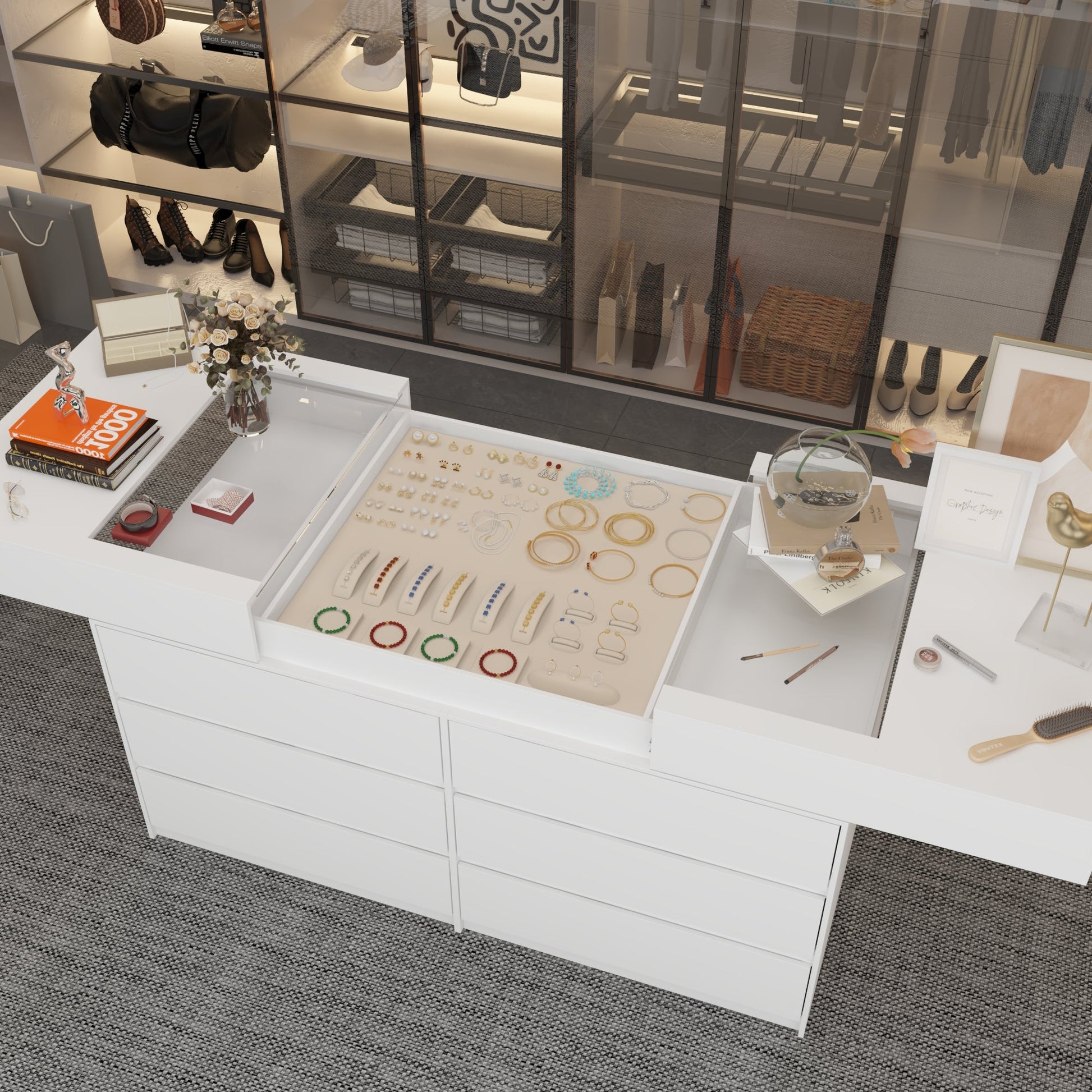 If you are an exquisite person, then this stylish and elegant storage cabinet combined with super storage capacity will definitely be loved by you. There is a big shelf under the tempered glass countertop, which can display your watch, jewelry, tie, etc. at a glance. In addition, there are 12 drawers that can help you classify and store various skincare products, cosmetics, or clothing. The white appearance combined with tempered glass makes the cabinet more exquisite and elegant, helping you store items. It would be great to place it in your cloackroom.