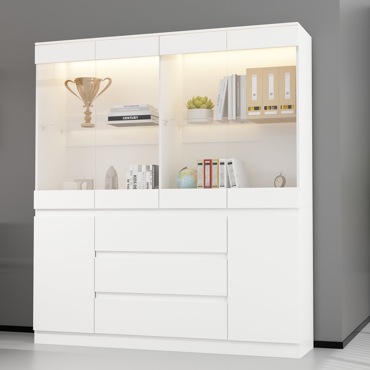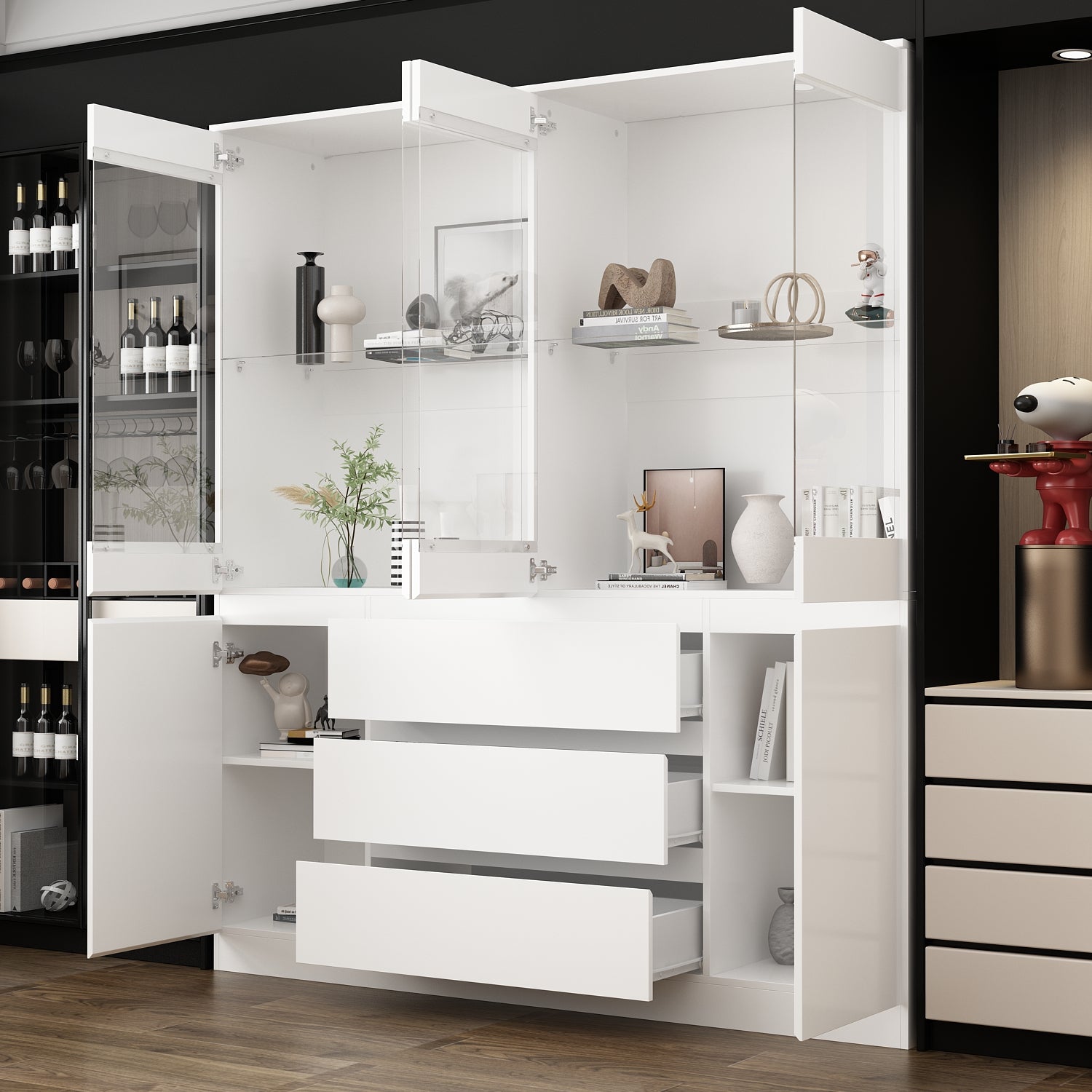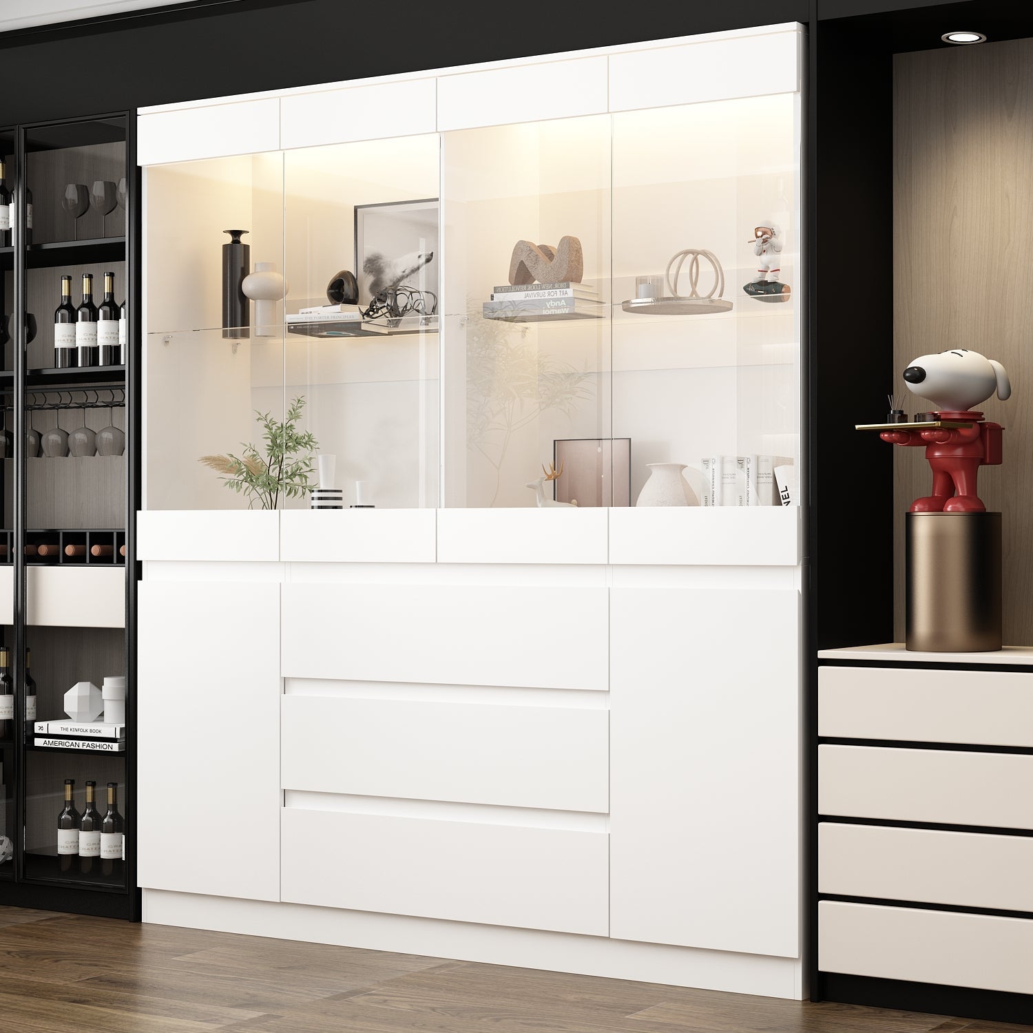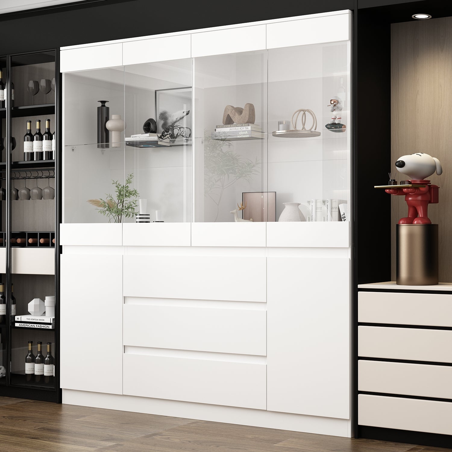 This is a high-end display cabinet that will surprise you! It is the best choice to place this cabinet in your living room, bedroom, kitchen, or dining room. The upper half of it is a cabinet made of tempered glass and has built-in light strips that can emit three different colors of light. The lower part consists of two cabinets and three drawers, meeting your storage needs for private items and hiding all the clutter in your daily life.